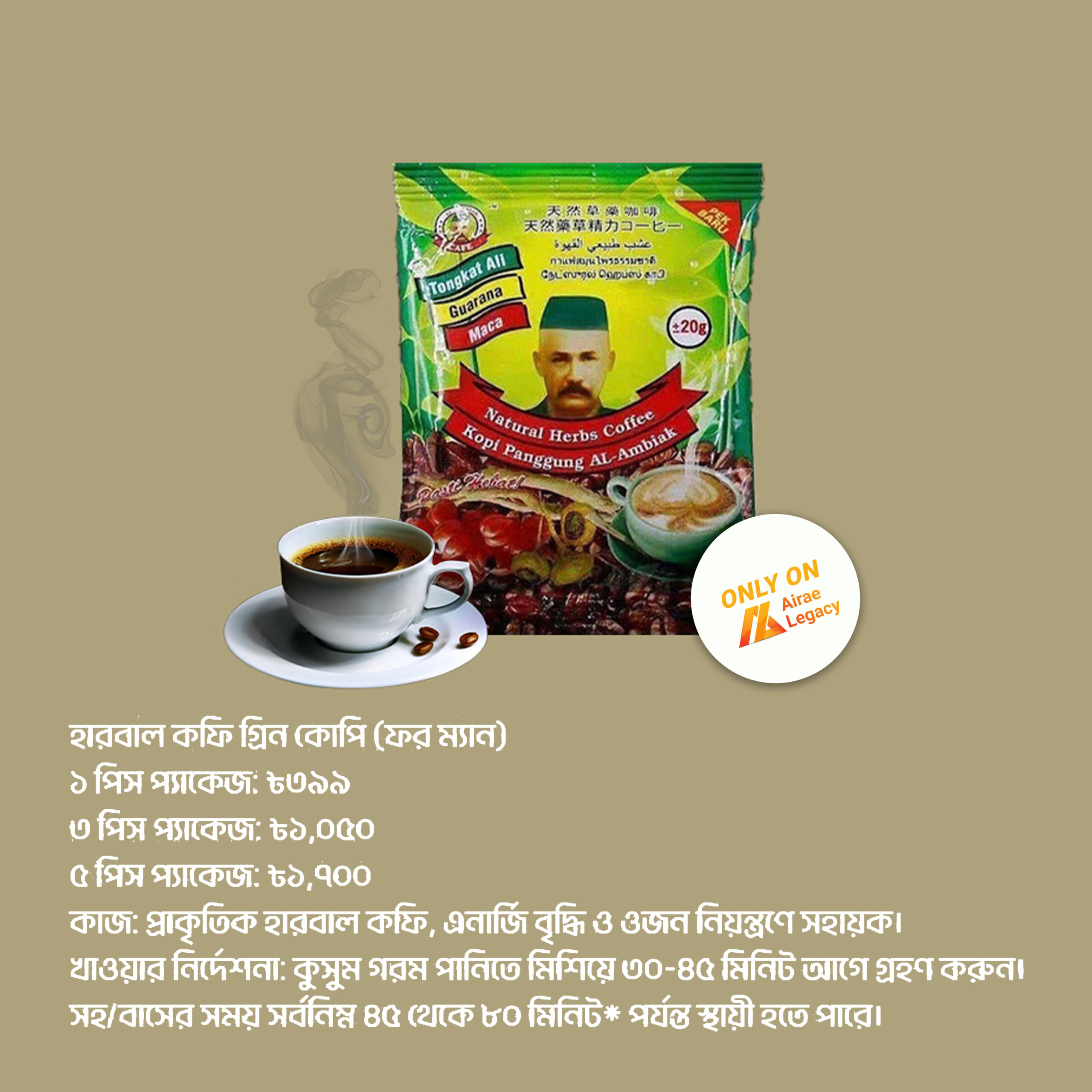 এই হারবাল কফি একটি প্রাকৃতিক উপাদানে তৈরি ইনস্ট্যান্ট কফি, যা বিশেষভাবে পুরুষের স্বাস্থ্যকে কেন্দ্র করে তৈরি।